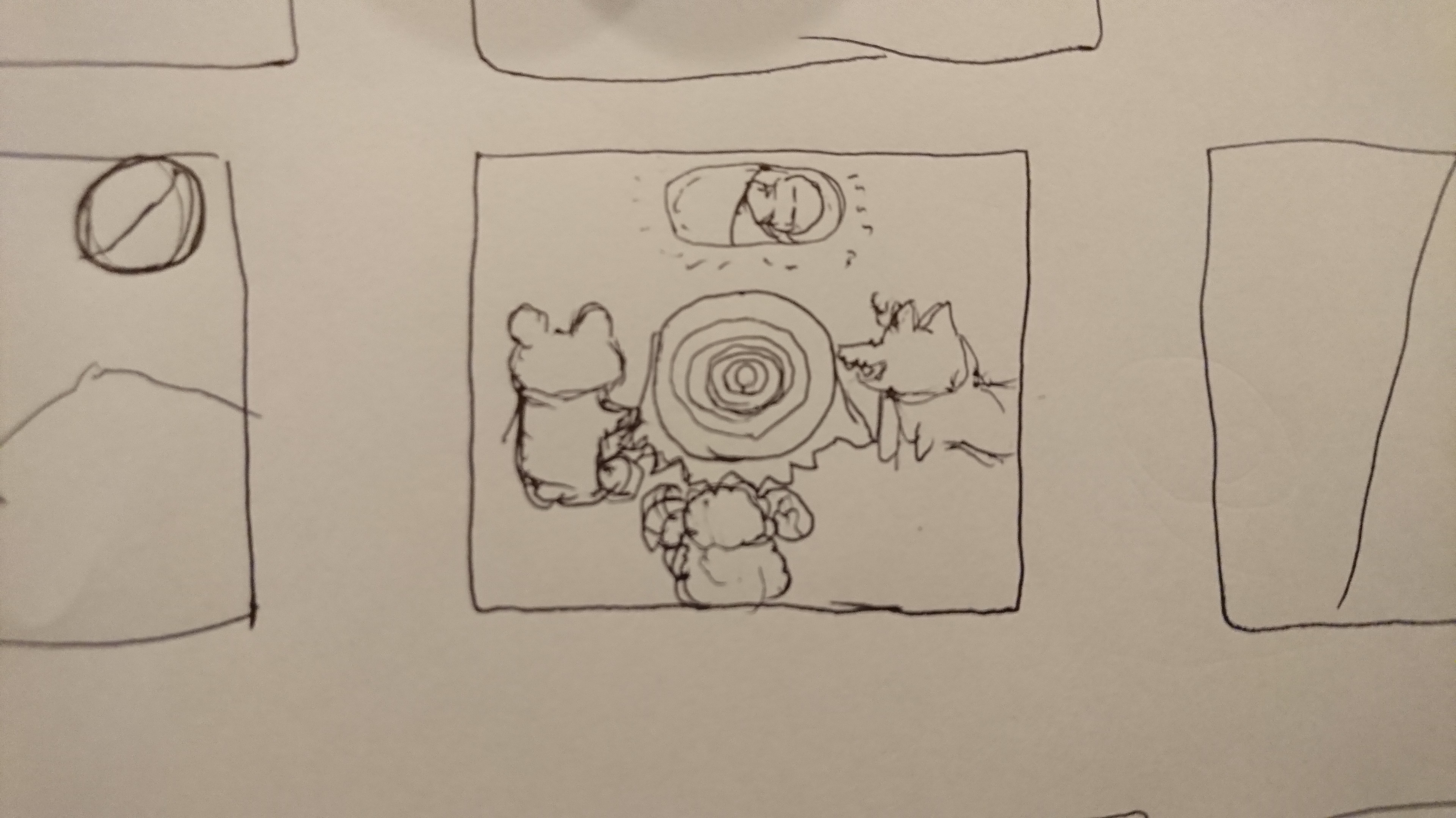・動物達(狼、羊、熊)が満月の夜の森の中で話し合いをしている最中に空からゆっくりと布に包まれた光る人間の赤ちゃんのようなものが降ってきて、それをまじまじと見ている。